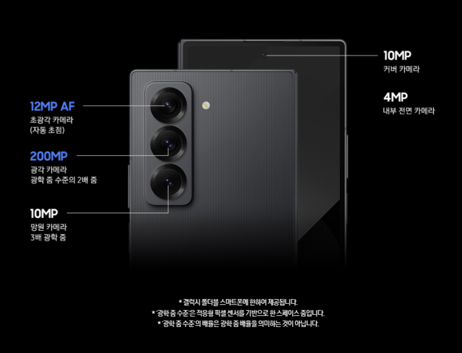 그리고 갤럭시 Z 시리즈 최초로 2억 화소의 광각 카메라가 탑재되어 생생하고 선명한 사진과 동영상 촬영을 할 수 있게 되었다.